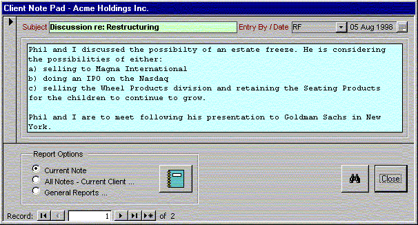 Client Note Pad A great feature for recording discussions - take a look - one click and you may print, fax or email your notes.