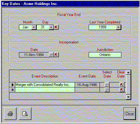 Key Dates - Instant access to Date of Incorporation and any other dates such as date of merger or acquisition. Take a look at the Key Dates form. The descriptions and dates of an unlimited number of events may be recorded for each client.